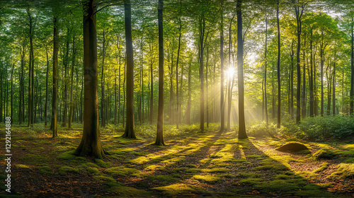 Sunlit green forest with tall trees, moss-covered ground, and tranquil atmosphere for nature, relaxation, and conservation themes