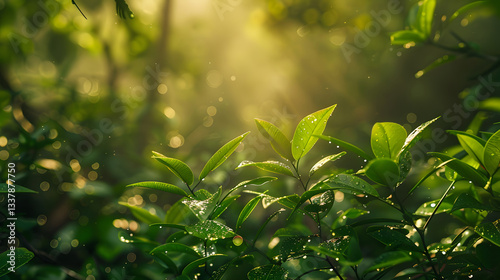 Sunlit Greenery with Dewdrops – A Refreshing Natural Scene