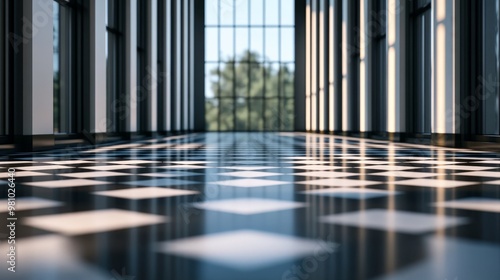 Sunlit hallway with reflective checkered floor and large windows, creating a modern architectural design and open, inviting space.