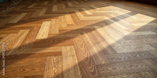 Sunlit Herringbone Wood Floor A Detailed Close-Up Image of Warm-Toned Planks Interlocking in a Classic Pattern