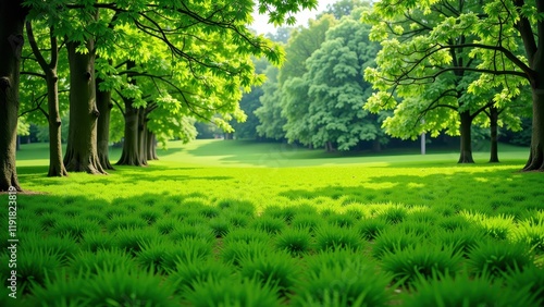 Sunlit leaves dapple a lush green field, framed by tree-lined borders; nature's serene embrace in every beam of light