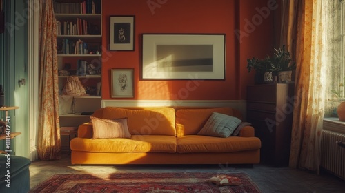 Sunlit Living Room Featuring Mustard Sofa and Artwork