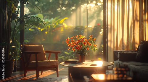 Sunlit living room, tropical garden view, morning calm, flowers centerpiece, home design