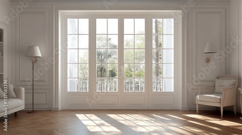 Sunlit living room with French doors, armchair, and hardwood floor.