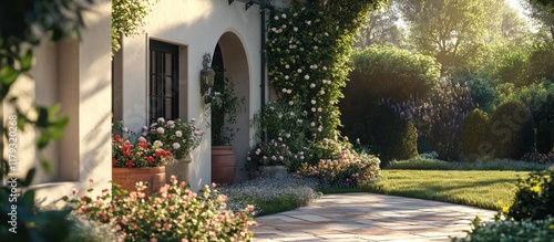 Sunlit Mediterranean house entrance with blooming flowers and lush garden.