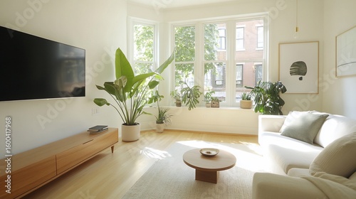 Sunlit Minimalist Living Room with Bay Window, Lush Greenery, and Modern Furniture