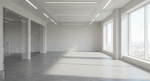 Sunlit Modern Office: Spacious Concrete Floor, Glass Walls AI Generated