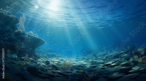 Sunlit Ocean Floor with Rocky Structures and Marine Flora