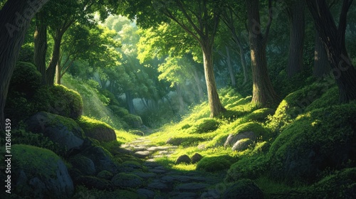 Sunlit Path Through a Mossy Forest