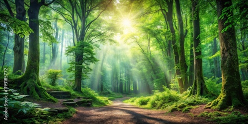 Sunlit Path Through a Mystical, Moss-Covered Forest with Sunlight Streaming Through the Canopy