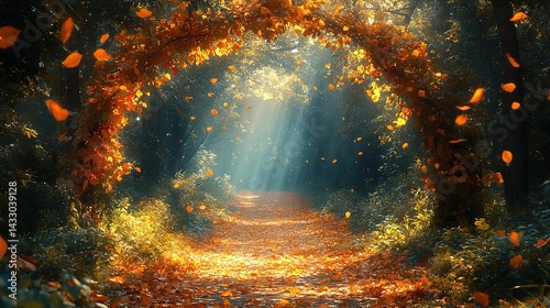 Sunlit Path Through Autumn Forest with Falling Leaves and Archwa
