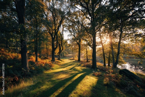 Sunlit Path Through Autumnal Woodland Scene with Trees and Shadows