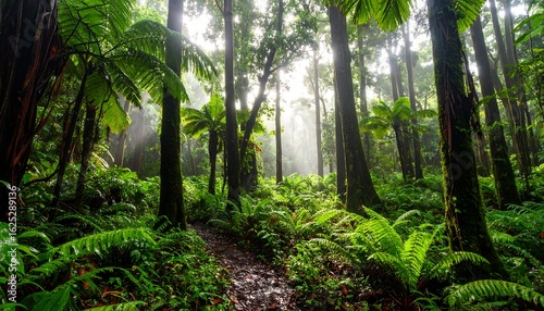 Sunlit Path Through Lush Rainforest with Ferns and Towering Trees