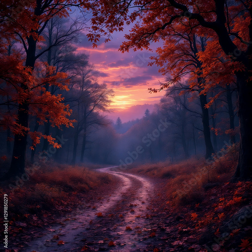Sunlit Path Winding Through an Autumn Forest at Golden Hour