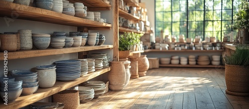 Sunlit pottery shop interior with wooden shelves stocked with ceramic bowls, plates, and vases.