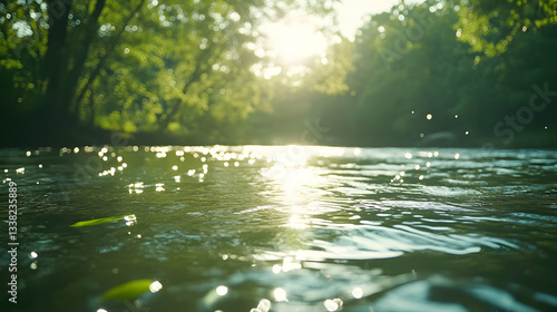 Sunlit river with sparkling water in forest setting during daytime