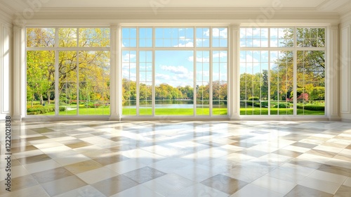 Sunlit room, autumnal park view, large windows, checkerboard floor, interior design