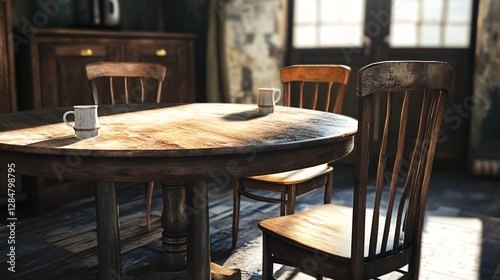 Sunlit Rustic Dining Room with Worn Wooden Table and Chairs