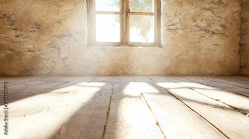 Sunlit rustic room interior, wooden floor, stone walls, window view, peaceful atmosphere; ideal for product display or background