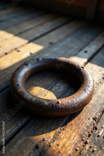 Sunlit Rustic Wooden Surface with Weathered Metal Ring