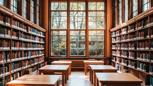 Sunlit Serenity: A tranquil library interior bathed in sunlight through towering windows, illuminating the shelves of books.