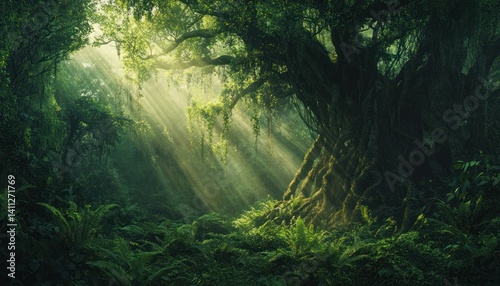 Sunlit serenity: Mystical forest atmosphere with beams illuminating lush greenery