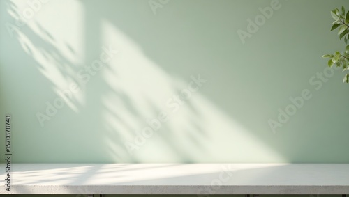 Sunlit Shadows: A serene display, where soft sunlight casts captivating leaf shadows upon a pale green wall and stone-like surface, invoking a feeling of tranquility and natural beauty.