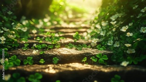 Sunlit Stone Path Through Lush Green Forest with White Flowers