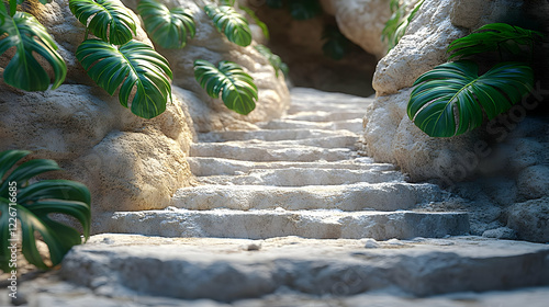 Sunlit Stone Steps Through Lush Tropical Foliage
