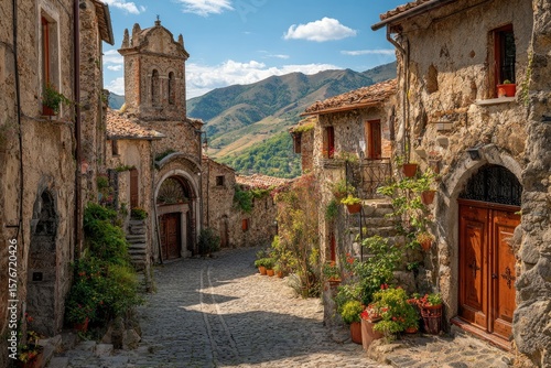 Sunlit stone street in a picturesque hilltop village, featuring traditional architecture, potted plants, and a church bell tower overlooking a valley