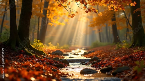Sunlit Stream Through an Autumnal Forest with Golden Leaves and Sunbeams