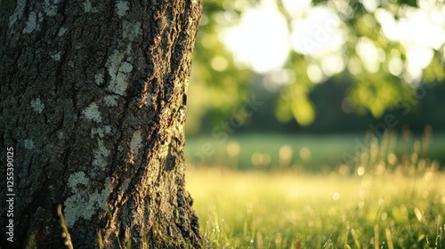 Sunlit Tree Trunk and Grassy Meadow - Nature's Serene Beauty