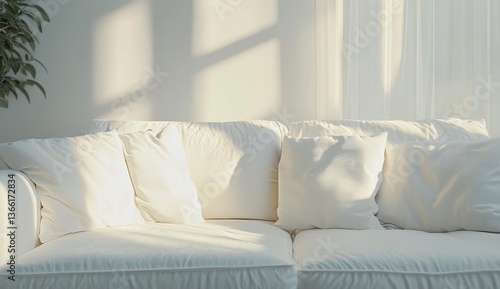 Sunlit White Couch with Textured Pillows in Minimalist Room