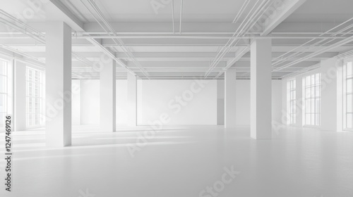 Sunlit white minimalist office space, large windows, empty floor, potential for design