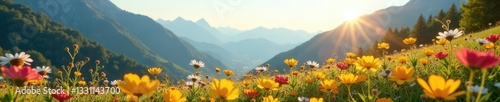 Sunlit wildflowers sway gently in the breeze amidst mountains, terrain, petals