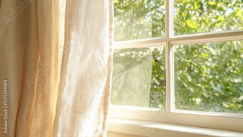 Sunlit Window with Sheer Curtains and Lush Greenery