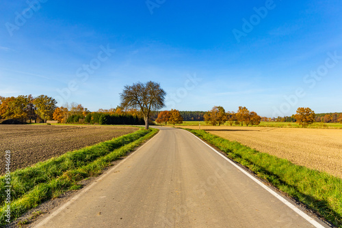 Sunny autumn day in european countryside. Rural road. Czech Republic.