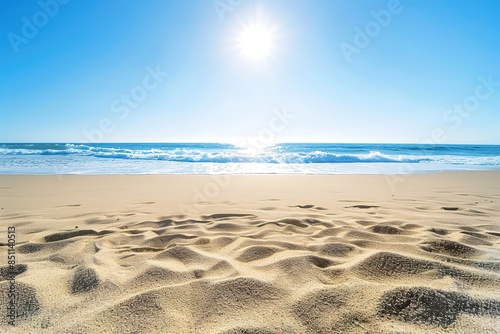 sunny beach background with soft sand, blue sky, and gentle waves. The sun is shining brightly in the distance, casting long shadows
