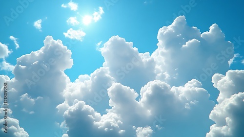 Sunny day, fluffy cumulus clouds in bright blue sky.