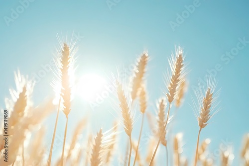 Sunny day, wheat field background, blue sky, close-up of wheat ears, macro photography, high-definition photography, bright colors, natural light, soft tones, clear details, and a warm atmosphere. The