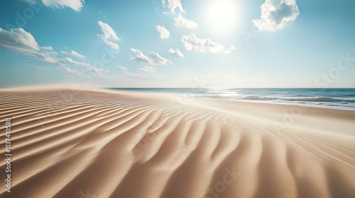 Sunny desert meets ocean; windswept sand dunes, blue sky, bright sun.
