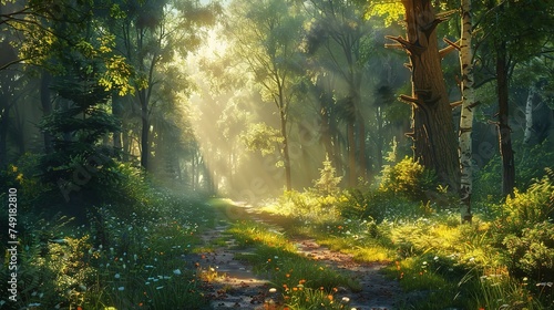Sunny forest early in the morning