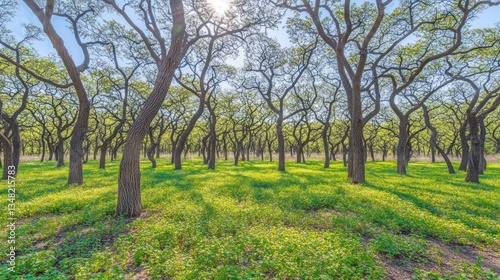 Sunny forest glade with vibrant green grass
