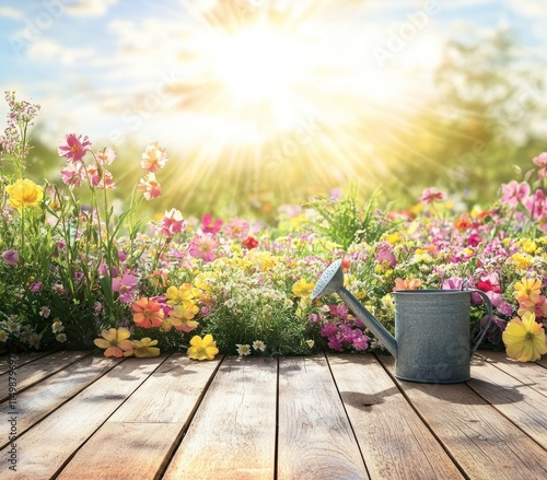 Sunny garden with colorful flowers and watering can on wooden planks.