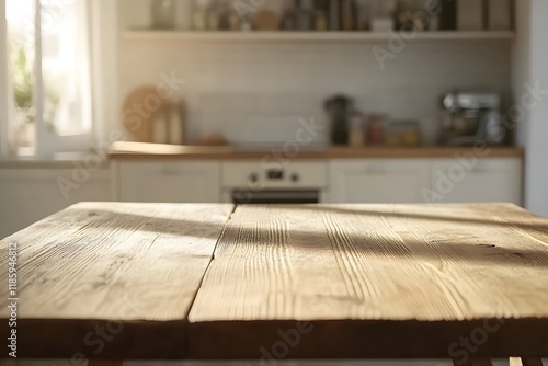 Sunny kitchen table, sunlight, wood, countertop, breakfast, room, interior, design, food, mockup
