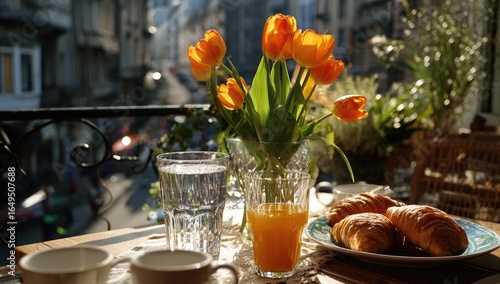 Sunny morning breakfast on a balcony overlooking a city street. A bouquet of orange tulips, juice, water glasses, and croissants sit on a wooden table