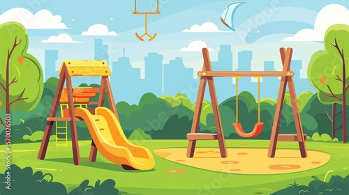 Sunny park scene with swings, slide, trees, and city skyline invites children to play on the playground.