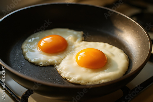 Sunny side up eggs cooking in a non stick pan on a gas stove with natural morning light highlighting the vibrant yolks