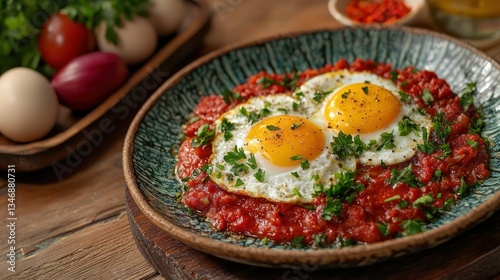 Sunny Side Up Fried Eggs Delight on Wooden Table Fresh Meal Served with Tomato Paste and Parsley Healthy Diet