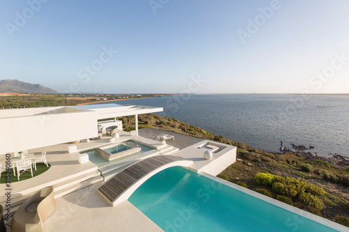 Sunny, tranquil modern luxury home showcase exterior with infinity pool and ocean view